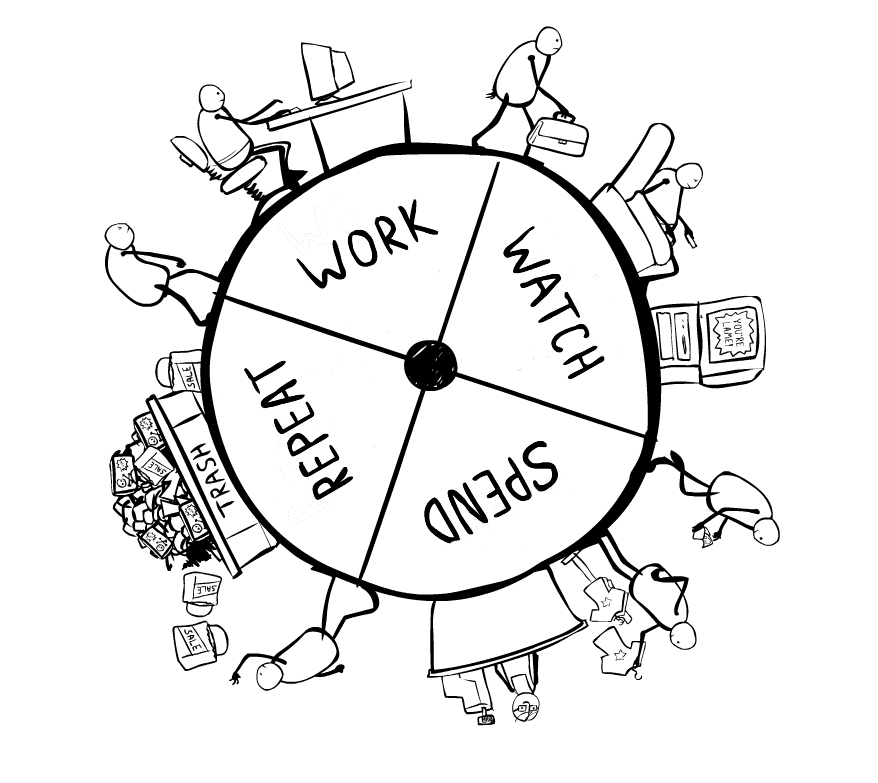 El mercado -dice el economista John Kenneth Galbraith– está diseñado para darnos dosis homeopáticas de satisfacción cuyos efectos son pasajeros, porque solo así se garantiza que sigamos consumiendo los sucedáneos de satisfacción que vende. Como ilustra Annie Leonard en su maravilloso libro y mini video “La Historia de las Cosas”, nuestro estilo de vida está basado en trabajar, ver TV o Internet para ver qué compramos y consumir… y trabajar para pagar lo que compramos, ver TV…